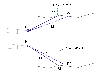 Kann zum Überschreiben des festen Werts für Max Versatz und zum Binden des maximalen Versatzes an eine Achsparallele verwendet werden. Folgende Objekttypen können beim Festlegen des Versatzes als Ziele verwendet werden: Achsen, Polylinien, Elementkanten oder Vermessungslinienzüge. |
