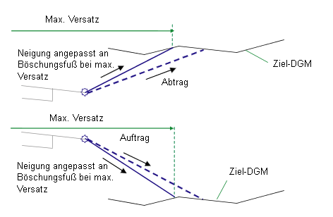 Ggf. wird die Neigung so angepasst, dass der Böschungsfußpunkt innerhalb eines maximalen +/- Versatzes zur Basislinie erhalten bleibt.