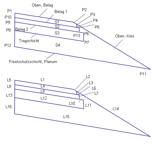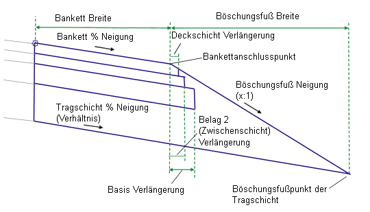 Die Deckschicht-, Zwischenschicht- und Basis (Urgelände)-Oberflächenverknüpfungen werden mit den angegebenen Tiefen parallel zur Oberkante Deckschicht eingefügt. Wenn die Werte für Verlängerung der Schicht ungleich null sind, wird jede Schicht um den angegebenen Abstand über den Bankett-Anschlusspunkt hinaus verlängert. Erstreckt sich eine Schicht über die Böschungsfußneigung hinaus, wird diese Schicht am Schnittpunkt mit der Böschungsfußneigung beendet. Jede Schicht sollte mindestens so stark wie die darüber liegende sein.