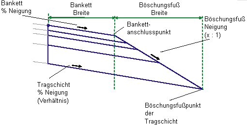 In der Entwurfsdarstellung stellt dieser Querschnittsbestandteil basierend auf dem Vorgabebankett und der Querneigung der Tragschicht die Verknüpfungen dar, aus denen das Bankett für die normale Straße mit Dachprofil besteht.