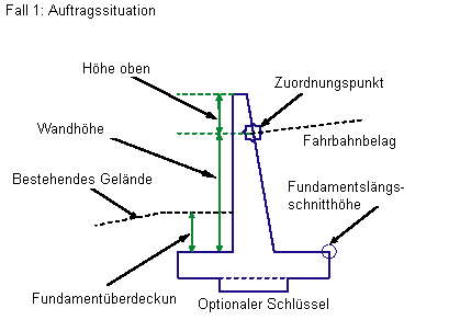 | FundamentÜberdeckung | Die Tiefe der Überdeckung vom oberen Ende des Fundaments bis zur Oberkantenneigungslinie auf der Wandrückseite im Auftrag oder bis zum Ansatz im Abtrag. | Numerisch |