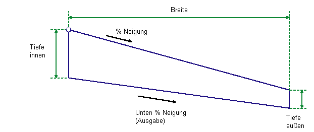Die Deckschicht der Profilart wird für die gegebene Breite und mit einer prozentualen Neigung vom Zuordnungspunkt aus nach außen eingefügt. Die Neigung der unteren Verknüpfung wird auf Basis der Tiefe innen und der Tiefe außen des Profils berechnet. Die Codes für Punkt, Verknüpfung und Profil werden in den Eingabeparametern mithilfe der benutzerdefinierten Zeichenfolgen festgelegt.