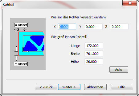 Sie können das Formular Rohteil verwenden, um die Größe und Position des Rohteils festzulegen.