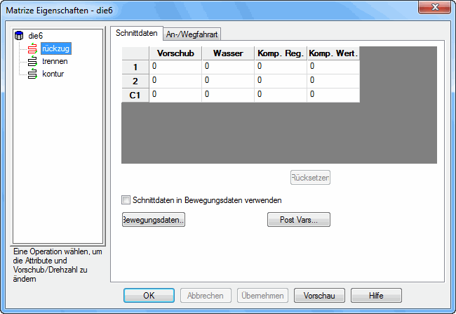 Auf der Registerkarte Schnittdaten im Dialogfeld Drahtfeature-Eigenschaften werden die Vorschub-, Wasser- und Werkzeugkompensationsregister für jeden Durchlauf der in der Baumansicht ausgewählten Operation angezeigt.