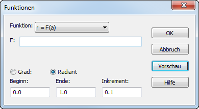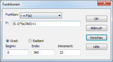 Die Funktion r = F(a) eignet sich zum Beschreiben von Polarfunktionen, bei denen der Radius in Abhängigkeit vom Winkel oder von der Argumentvariable berechnet wird.