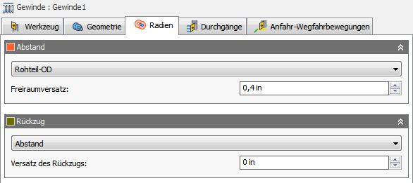 Auf der Registerkarte Radien können Sie einen radialen Begrenzungsbereich für die Bearbeitung festlegen. Diese Parameter sind farblich gekennzeichnet, damit sie leichter zu erkennen sind.