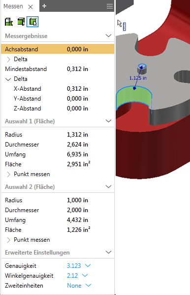 Anmerkung: Durch Ändern der Priorität ändert sich auch der Messtyp für den gemessenen Mindestabstand. So kann z. B. der Mindestabstand zwischen Komponenten oder zwischen Bauteilen gemessen werden. Die Standardeinstellung für den Befehl ist Flächen und Kanten auswählen. Wenn Sie Komponentenpriorität in einer Baugruppe verwenden, können Sie nur Komponenten als gültige Auswahl wählen, keine Flächen. Bei einer Änderung der Auswahlpriorität nach der ersten Auswahl wird der Befehl zurückgesetzt.
