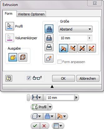Die verfügbaren Optionen in diesen Mini-Werkzeugkästen sind die gleichen wie die Optionen im Dialogfeld. Sie können wählen, ob die Mini-Werkzeugkästen angezeigt oder ausgeblendet werden sollen, wenn Sie die folgenden sieben Befehle aufrufen: Extrusion, Drehung, Rundung, Wandung, Flächenverjüngung, Fase und Gelenk. Die Mini-Werkzeugkästen werden vorgabemäßig nicht angezeigt.