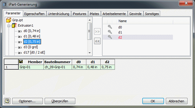 Öffnen Sie beispielsweise die Beispiel-Leitungs-iParts unter Autodesk\Inventor Professional <Version>\Tutorial Files\Tube & Pipe\Example_iparts\pipe.ipt. Doppelklicken Sie im Modell-Browser auf Tabelle, um das iPart-Generierungsdialogfeld zu öffnen.