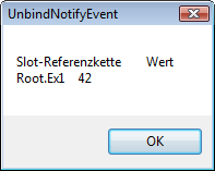 // Test of UnbindNotifyEvent ModelEvents modelEvents = ModelEvents.Instance; modelEvents.UnbindNotify += UnbindNotifyHandler; Application.Run(new MainWindow(UIMode)); modelEvents.UnbindNotify ‐= UnbindNotifyHandler;Der Ereignis-Handler für das einfache Meldungsfeld: