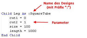 Child <name> As <DesignNameExpression> [, <Quantity = Expression>] <ParameterAssignmentList> End Child