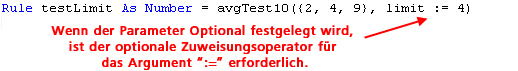 Um den Wert der optionalen Wertgrenze zu überschreiben, weisen Sie im Funktionsaufruf einen neuen Wert zu (beachten Sie die Verwendung des Zuweisungsoperators :=).