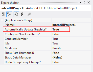 Vorgabemäßig veranlasst das IntentUIProject-Steuerelement keine automatische Aktualisierung von Grafiken, wenn eine Änderung am Intent-Modell stattfindet. Dieses Verhalten ermöglicht Ihnen, eine Reihe von Änderungen vorzunehmen, ohne dass es zwischen den einzelnen Änderungen zeitraubende Grafikaktualisierungen gibt. Allerdings ist das vorliegende Beispielprojekt so einfach, dass es nicht zu wesentlichen Leistungseinbußen führen würde, wenn automatische Aktualisierungen aktiviert würden. Gehen Sie zu dem IntentUIProject-Steuerelement, das dem Formular hinzugefügt wurde, und legen Sie unter Eigenschaften die Option Grafiken automatisch aktualisieren? auf True fest.