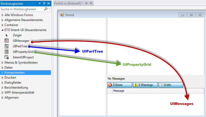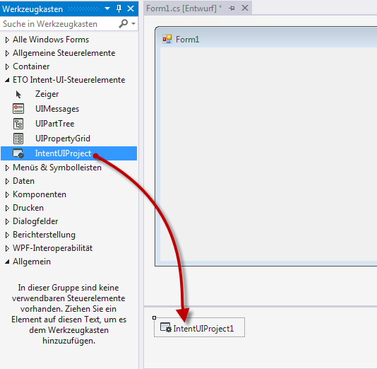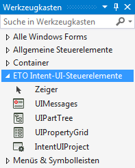Nachdem diese DLL-Referenzen hinzugefügt wurden, fügen Sie die verschiedenen Steuerelemente der UI-Werkzeuge aus der Visual Studio-Toolbox hinzu. Diese Steuerelemente befinden sich in der Toolbox auf einer Registerkarte mit dem Namen ETO Intent UI-Steuerelemente.