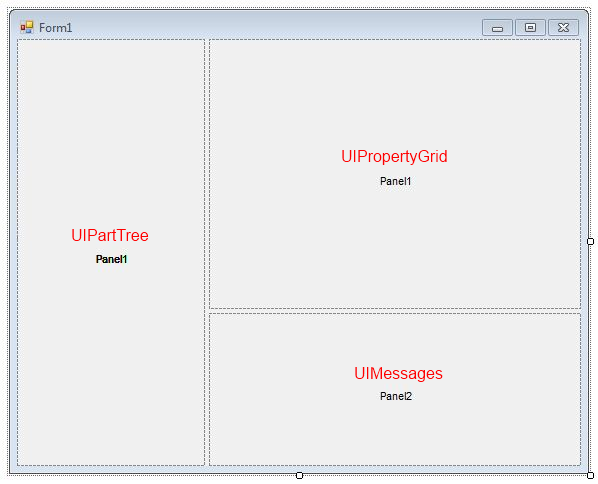 Bevor Sie die restlichen drei Steuerelemente zu der Benutzeroberfläche hinzufügen, fügen Sie einige Teilbereiche hinzu. Sie können die Steuerelemente dann einfach in dem Formular anordnen und ihre Größe ändern. In diesem Beispiel befindet sich das Steuerelement UIPartTree auf der linken Seite, während die Steuerelemente UIPropertyGrid und UIMessages auf der rechten Seite übereinander angeordnet sind.