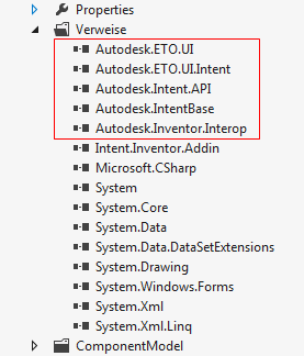 Bevor Sie Steuerelemente der UI-Werkzeuge zu dem Zusatzmodul-Formular hinzufügen können, müssen Sie zunächst Referenzen auf die UI-Werkzeug-Assemblys zu dem Visual Studio 2012-Projekt hinzufügen. Es gibt zwei DLL-Referenzen, die zur Verwendung der UI-Werkzeuge erforderlich sind: Autodesk.ETO.UI.dll und Autodesk.ETO.UI.Intent.dll. Außerdem sind Referenzen auf die Hauptbaugruppen Autodesk.Intent.API.dll und Autodesk.IntentBase.dll erforderlich. Schließlich wird noch eine Referenz auf Autodesk.Inventor.Interop.dll benötigt, da diese Benutzeroberfläche als Inventor-Zusatzmodul ausgeführt wird.