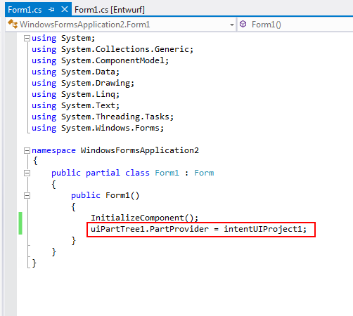 Sowohl für UIPropertyGrid als auch für UIMessages sind die PartProvider-Eigenschaften auf das UIPartTree-Steuerelement festgelegt. Für das UIPartTree-Steuerelement wiederum ist der PartProvider auf das IntentUIProject-Steuerelement festgelegt.
