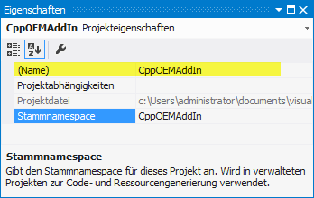Das Namensattribut des clrClass-Elements besteht aus zwei Teilen, die durch Punkte voneinander getrennt sind. Der erste Teil ist der Name Ihres Projekts, in diesem Beispiel CppOEMAddIn. Der zweite Teil ist der Name der Klasse, die die ApplicationAddInServer-Schnittstelle implementiert, in diesem Beispiel CppOEMAddInAddInServer: