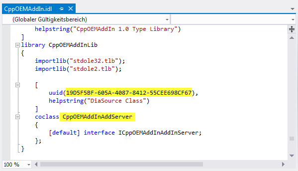 Die CLSID ist die Klassen-ID für Ihr Zusatzmodul, und sie befindet sich in der mit dem Zusatzmodul verknüpften IDL-Datei, wie in der folgenden Abbildung dargestellt. Die Klammern sind in der Manifestdatei erforderlich.