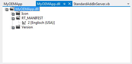 Um sicherzustellen, dass das Manifest korrekt eingebettet ist, ziehen Sie die Zusatzmodul-DLL in Visual Studio. Der Ordner "RT_MANIFEST" wird angezeigt, wie in der folgenden Abbildung dargestellt. Doppelklicken Sie auf das Symbol 2, um ein Fenster mit den tatsächlichen Manifestdaten anzuzeigen.