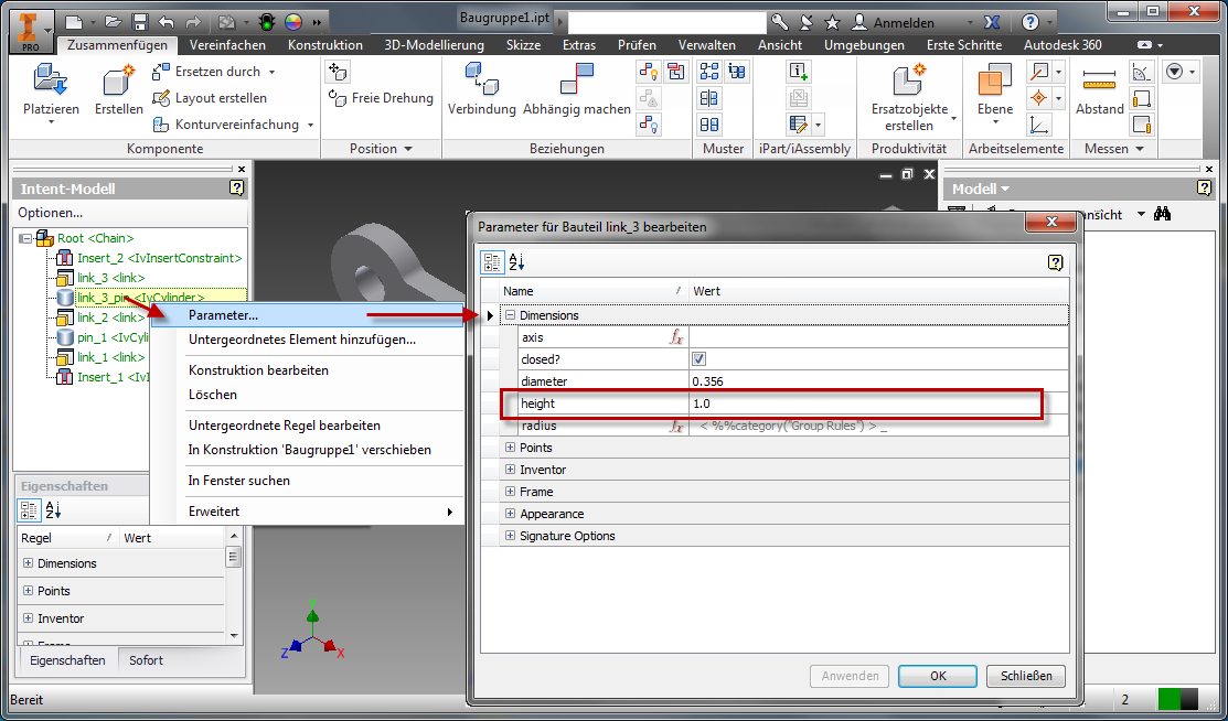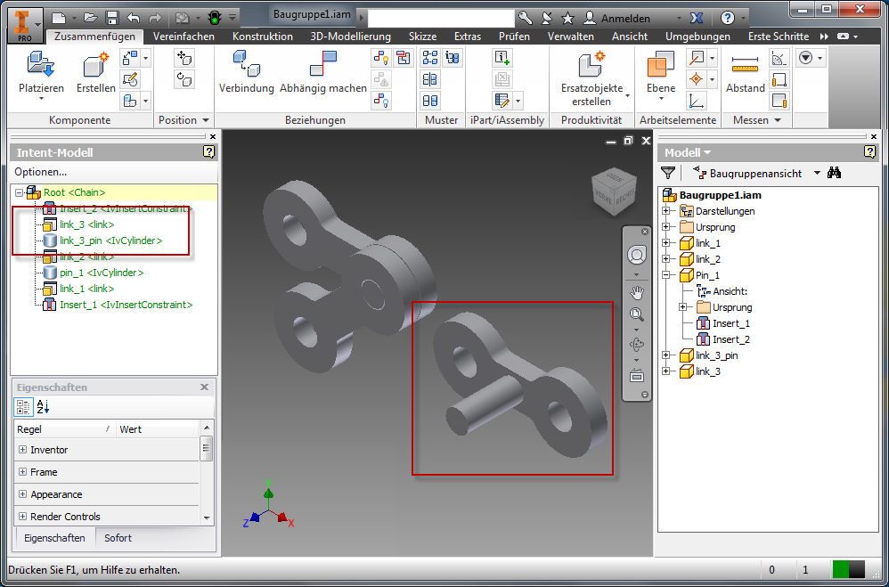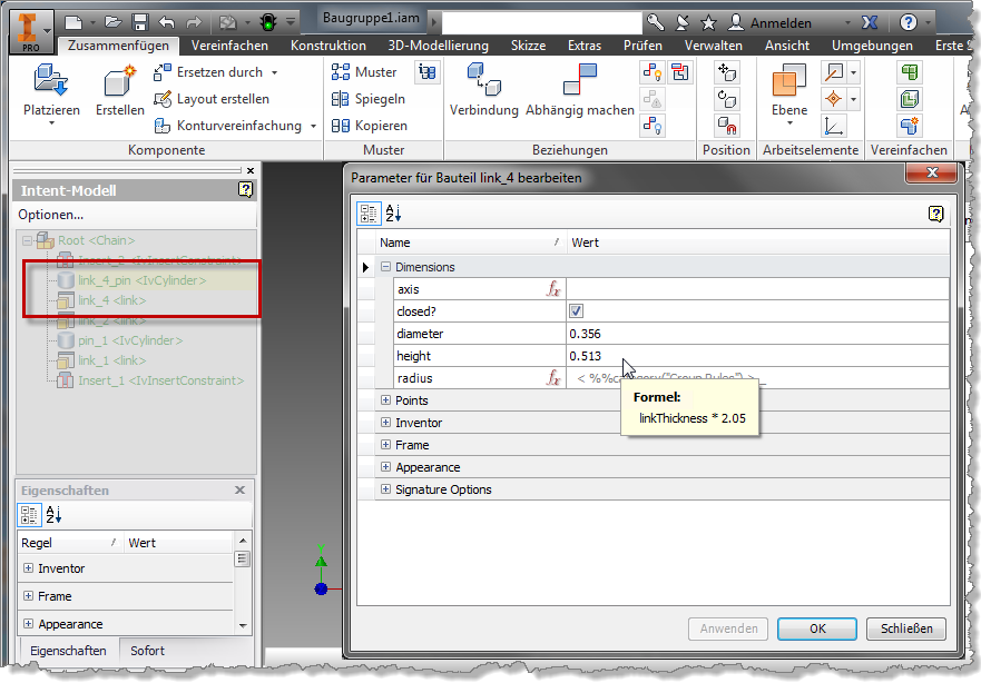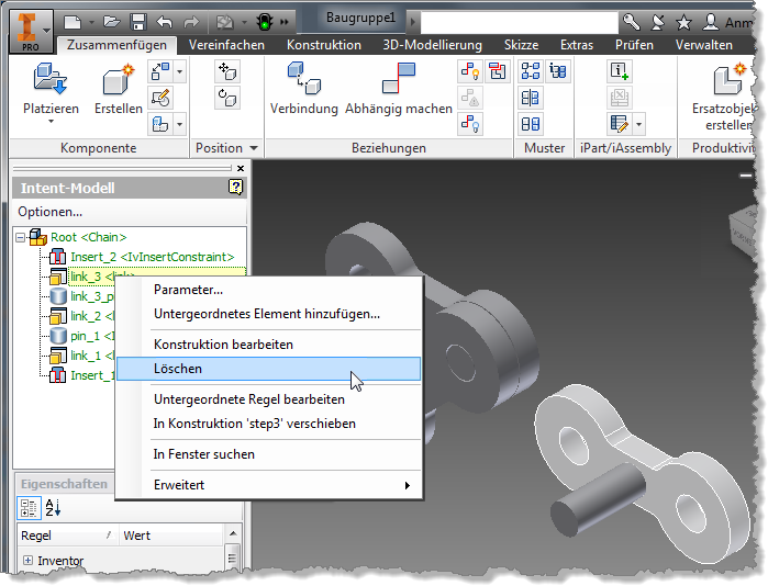 Nehmen wir jetzt an, wir möchten jedes Mal einen Stift (Zylinder) hinzufügen, wenn wir ein Kettenglied hinzufügen. Natürlich ließe sich dies über eine Baugruppe aus Stift und Zylinder umsetzen, doch so lägen weder (a) alle Stifte und Kettenglieder als gleichgeordnete Elemente vor, noch (b) könnten wir einen bestimmten Stift löschen, wenn wir ihn nicht mehr benötigen.