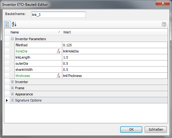 Fügen Sie nun über Untergeordnetes Element hinzufügen ein neues Kettenglied hinzu, um die Methode zu testen. Legen Sie im Dialogfeld Parameter holeDia auf linkHoleDia und thickness auf linkThickness fest.