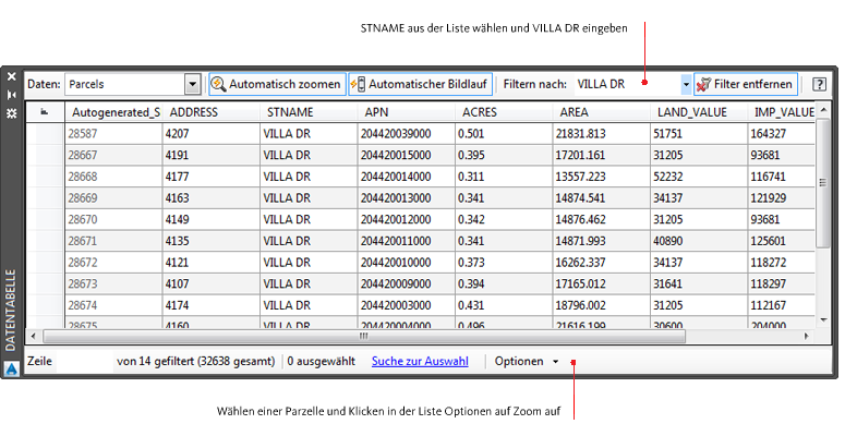 Zeigen Sie die Datentabelle für einen beliebigen Layer an. Filtern Sie die Datentabelle, um einen untergeordneten Satz mit Parzellen (in diesem Fall nur Parzellen im Villa Drive) anzuzeigen.