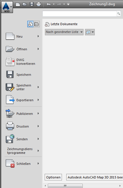 Das Anwendungsmenü enthält das Suchfeld sowie dateibezogene Befehle. Optionen ruft das Dialogfeld AutoCAD-Optionen auf, mit dem beispielsweise die Hintergrundfarbe von Karten gesteuert wird.