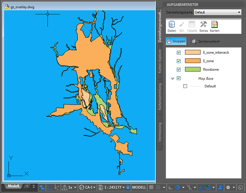In dieser Karte sind zwei Layer überlagert (ein Überschwemmungsgebiet und ein Industriegebiet). Mithilfe der Überlagerung können Sie sehen, wo sich die beiden Layer überschneiden. Die Überschneidungsfläche ist der neue Layer, dem Sie Stile zuweisen und den Sie in einer Datei speichern und als separaten Datenspeicher verwenden können.