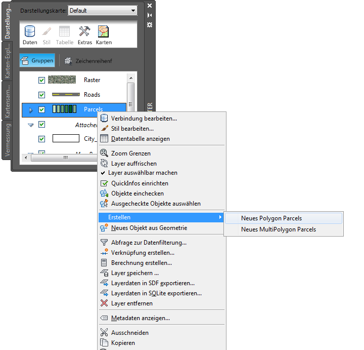 Jedes Element in AutoCAD Map 3D verfügt über ein individuelles Menü mit Befehlen, die zum jeweiligen Zeitpunkt für das betreffende Element zur Verfügung stehen.