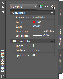 Auf der Registerkarte Objektklasse der Palette Eigenschaften werden die zu der Klasse des ausgewählten Objekts gehörigen Eigenschaften angezeigt.