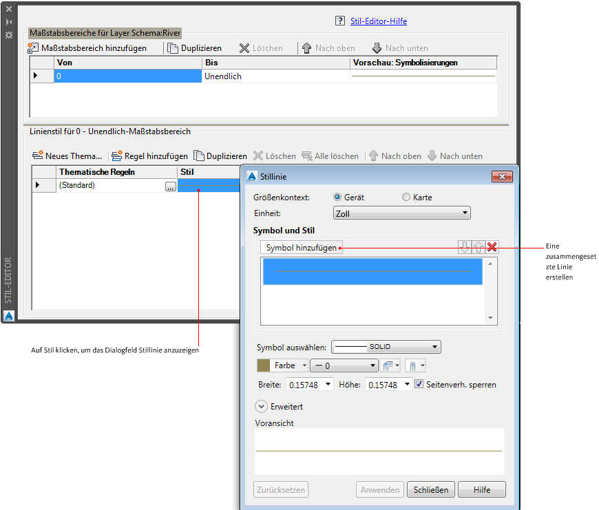 Nun definieren Sie Maßstabsbereiche und weisen ihnen Stile zu. Die einzelnen Maßstabsbereiche stellen die Zoomstufen dar, an denen ein Stil angezeigt wird. Wenn der Zoom zwischen den Stufen eines Bereichs liegt, wird der Stil für diesen Bereich angezeigt.