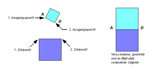 Aus der Winkeldifferenz zwischen den beiden Ausgangspunkten und den beiden Zielpunkten ergibt sich die Drehung.