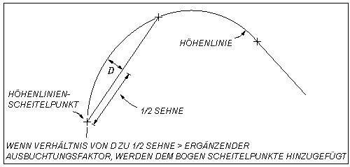 Bei Bogen ist der Ausbuchtungswert ein Verhältnis der Entfernung zwischen Bogen und Sehne geteilt durch die Hälfte der Sehnenlänge. Der Ausbuchtungsfaktor fügt Scheitelpunkte zu einer Polylinienkurve hinzu, sodass mit geraden Liniensegmenten ein Kurvenmodell erstellt wird. Die Länge dieser Segmente variiert je nach Ausbuchtungsfaktor und Grad der Krümmung.