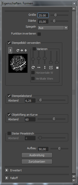 Im Fenster Eigenschaften werden die Attribute für ein ausgewähltes Objekt oder ein Werkzeug angezeigt. In diesem Fenster können Sie z. B. die Einstellungen für Formen- oder Mal-Werkzeuge bearbeiten oder Materialattribute ändern.