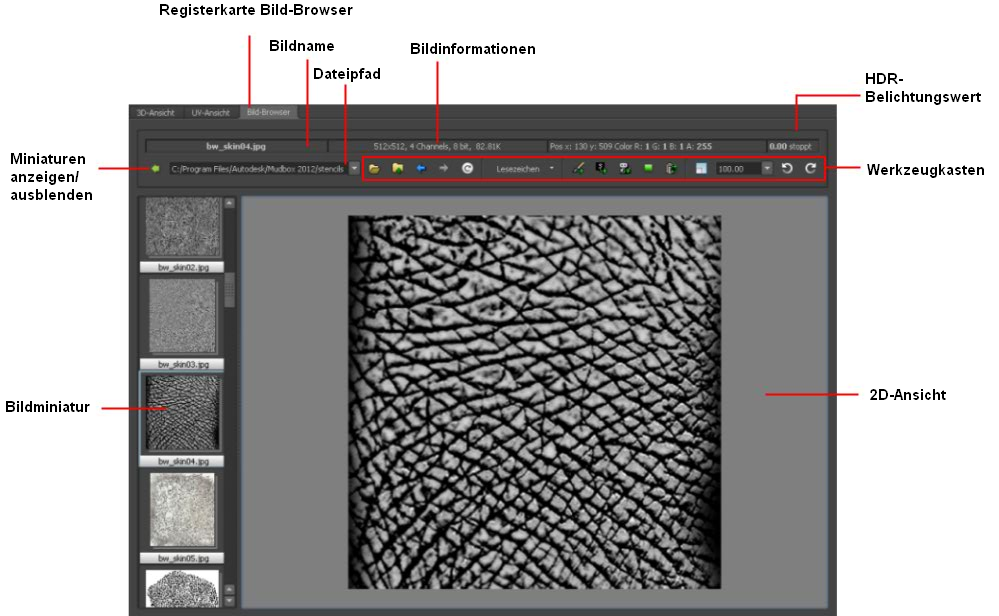 Im Bild-Browser können Sie 2D-Bilder und Texturen vom lokalen Laufwerk oder Netzwerk auswählen, anzeigen und beurteilen.