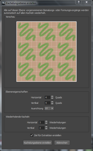 Um dieses Fenster zu öffnen, wählen Sie in der Hauptmenüleiste Erstellen > Kachelungsebene. Siehe auch Formen oder Bemalen auf einer Kachelungsebene.