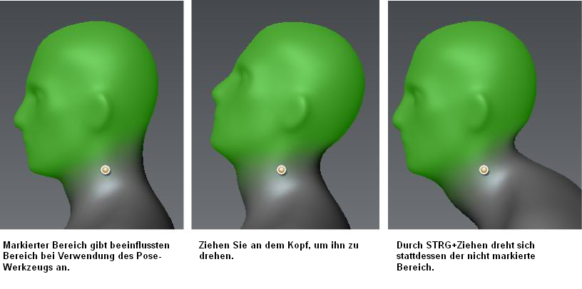 Mit dem Pose-Werkzeug drehen, verschieben oder skalieren Sie die Bereiche eines Modells, die mit einem Gelenk verknüpft sind. Alle Bereiche, für die Gewichtungsfarbe bei Auswahl des Gelenks angezeigt wird, werden beeinflusst. Die Sättigung des grünen gewichteten Bereichs gibt an, wie stark er durch das Gelenk beeinflusst wird. Sie können den Einflussbereich für ein Gelenk mit dem Werkzeug Gelenkgewichte anpassen (siehe Anpassen des Einflussbereichs an einem Gelenk).