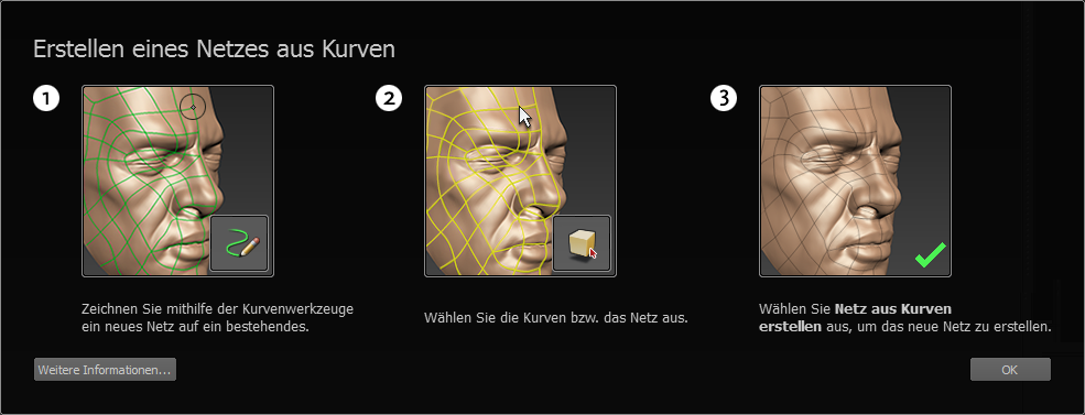 Dieses Fenster wird angezeigt, wenn Sie auf Hilfe im Fenster Netz aus Kurven erstellen klicken, oder wenn Mudbox bestimmte Arten von Problemen bei der Erstellung eines Netzes aus Kurven feststellt.