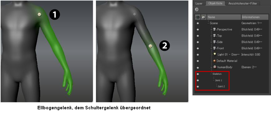 Wenn Sie beispielsweise ein Schultergelenk mit einem gewichteten Bereich auf dem gesamten Arm erstellen und anschließend ein Gelenk am Ellbogen, dessen Gewichtung Sie zum Handgelenk hin ziehen, wird das Ellbogengelenk automatisch dem Schultergelenk übergeordnet. Zwischen den beiden Gelenken wird ein Bone-Objekt angezeigt, um diese Beziehung zu verdeutlichen.