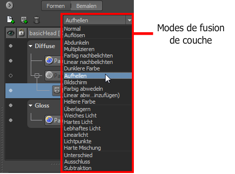 Mithilfe der Layer-Verschmelzungsmodi können Sie den Inhalt eines oder mehrerer Farb-Layer kombinieren und anzeigen und die Darstellungseigenschaften des fertig zusammengesetzten Farb-Layers (Textur-Maps) ändern.