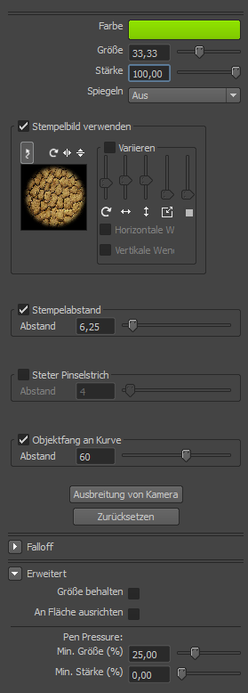 Sie können den Pinsel-Falloff schnell ändern, indem Sie eine Falloff-Voreinstellung aus der Palette Falloff wählen oder die Form der Falloff-Kurve im Abschnitt Falloff der Pinseleigenschaften bearbeiten.