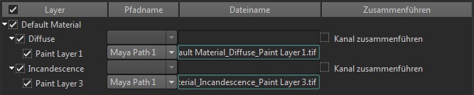 Wenn diese Option aktiviert ist, führt Mudbox die Effekte aller Farb-Layer in der entsprechenden Gruppe zusammen, sodass Sie bequem ein einzelnes Bild pro Kanal exportieren können. Die Farb-Layer werden in der exportierten Bilddatei zusammengeführt angezeigt, bleiben jedoch separat in Mudbox, damit Sie die Bemalung fortsetzen können. Siehe auch Exportieren von Farb-Layern.