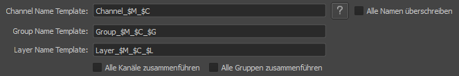 Vorgabemäßig werden Layer nach der Vorlage Layer_$M_$C_$L, Gruppen nach der Vorlage Gruppe_$M_$C_$G und Kanäle nach der Vorlage Kanal_$M_$C_$C benannt.