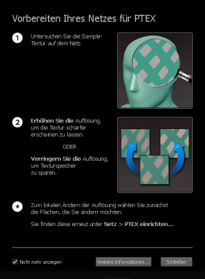 Dieses Fenster wird angezeigt, wenn Sie in der Hauptmenüleiste zum ersten Mal UVs & Maps > PTEX einrichten wählen.