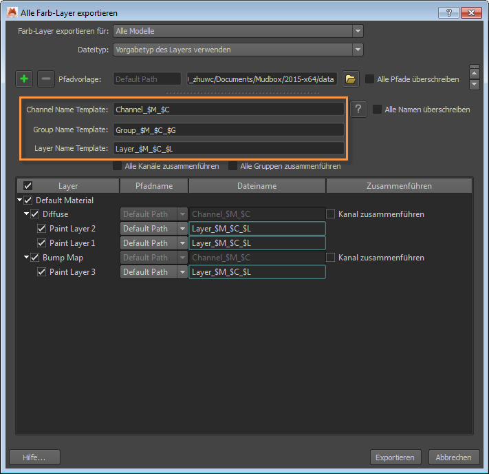 Alle Farb-Layer des gewählten Modells werden in dem im Fenster Alle Farb-Layer exportieren angegebenen Verzeichnis gespeichert. Standardmäßig werden Layer in Ihrem Datenverzeichnis gespeichert.