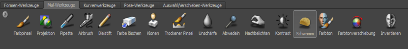 Das Schwamm-Werkzeug basiert auf einem Farbmodell auf Basis von Farbton, Sättigung und Wert (HSV), in dem der Sättigungswert für Pixel in einem Farb-Layer des Bereichs der Pinselführung geändert wird.