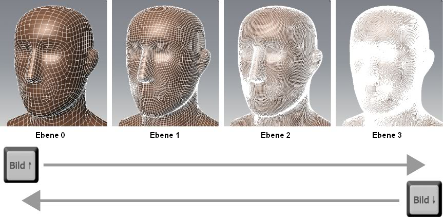 Anmerkung: Wenn Sie sich um eine Ebene nach oben oder unten bewegen, wird die vorherige Unterteilungsebene jedes Mal in der 3D-Ansicht ausgeblendet.