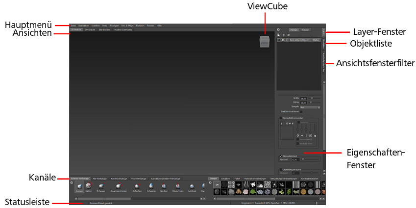 Die wichtigsten Bereiche der Mudbox-Benutzeroberfläche werden in den folgenden Abschnitten zusammengefasst: