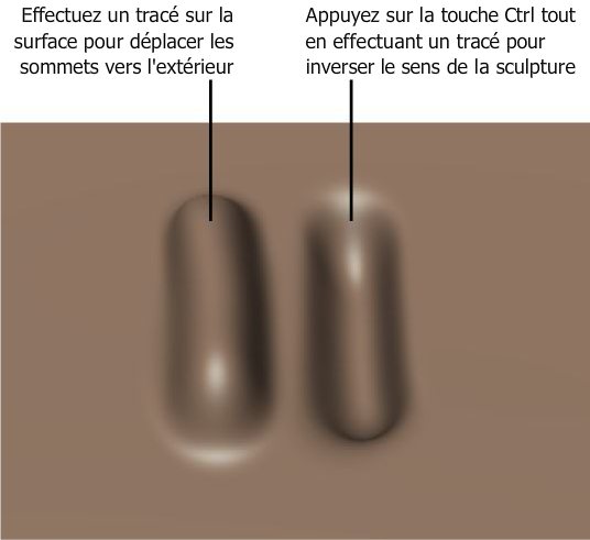 - Um die Formungsrichtung für ein beliebiges·Formen-Werkzeug umzukehren, drücken·Sie die STRG-Taste und klicken Sie bei gedrückter Maustaste den Cursor·über die Fläche·des Modells.